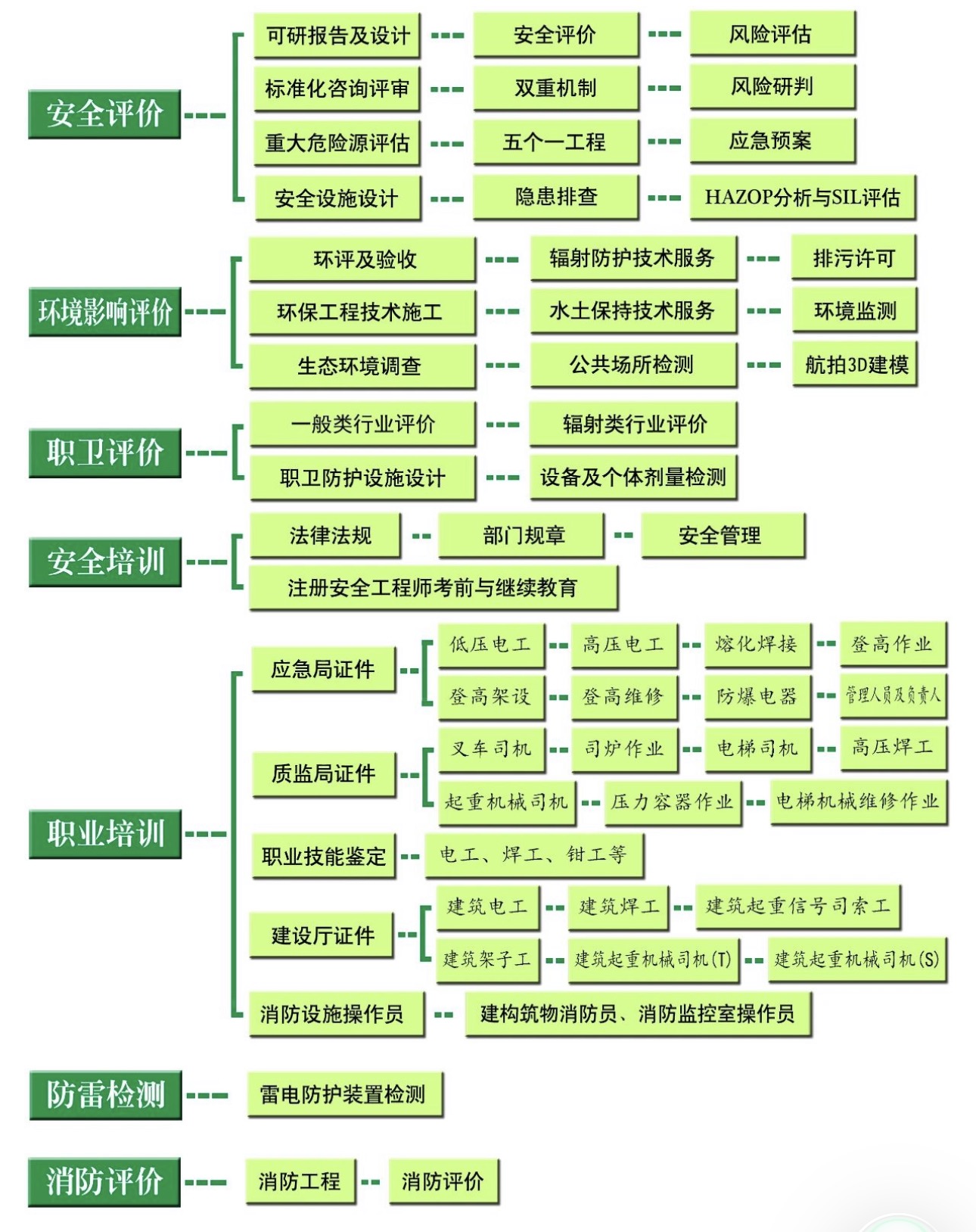 应急管理:应急管理体系建设、应急预案编制与修订、应急能力评估、应急演练组织策划、应急培训、事故应急处置咨询等;